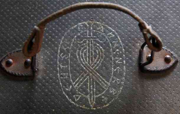 Note a tampa da mala, mostrando claramente o emblema oficial do Ahnenerbe, que consiste em runas.